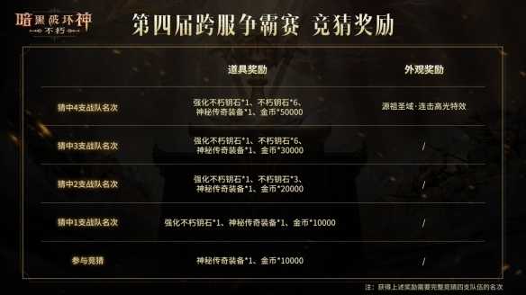 至少“押中”一支队伍的名次,就可以获得强化不朽钥石等丰厚的游戏道具奖励!